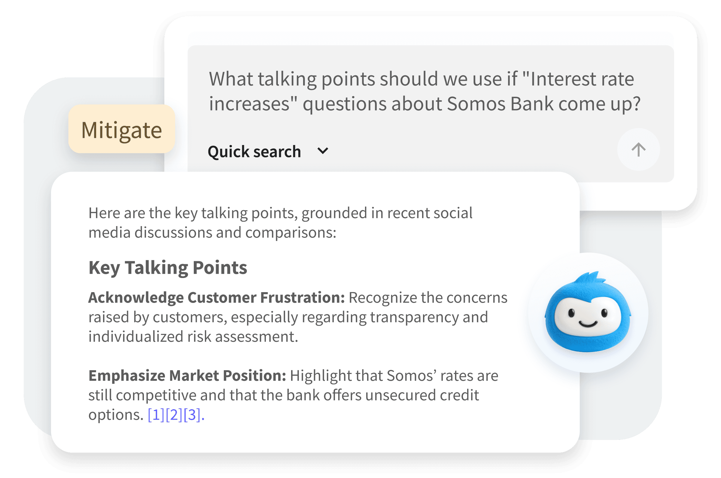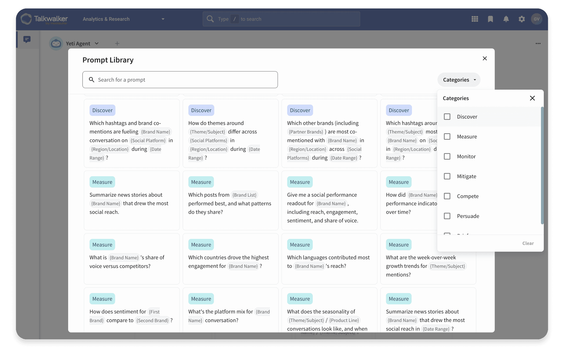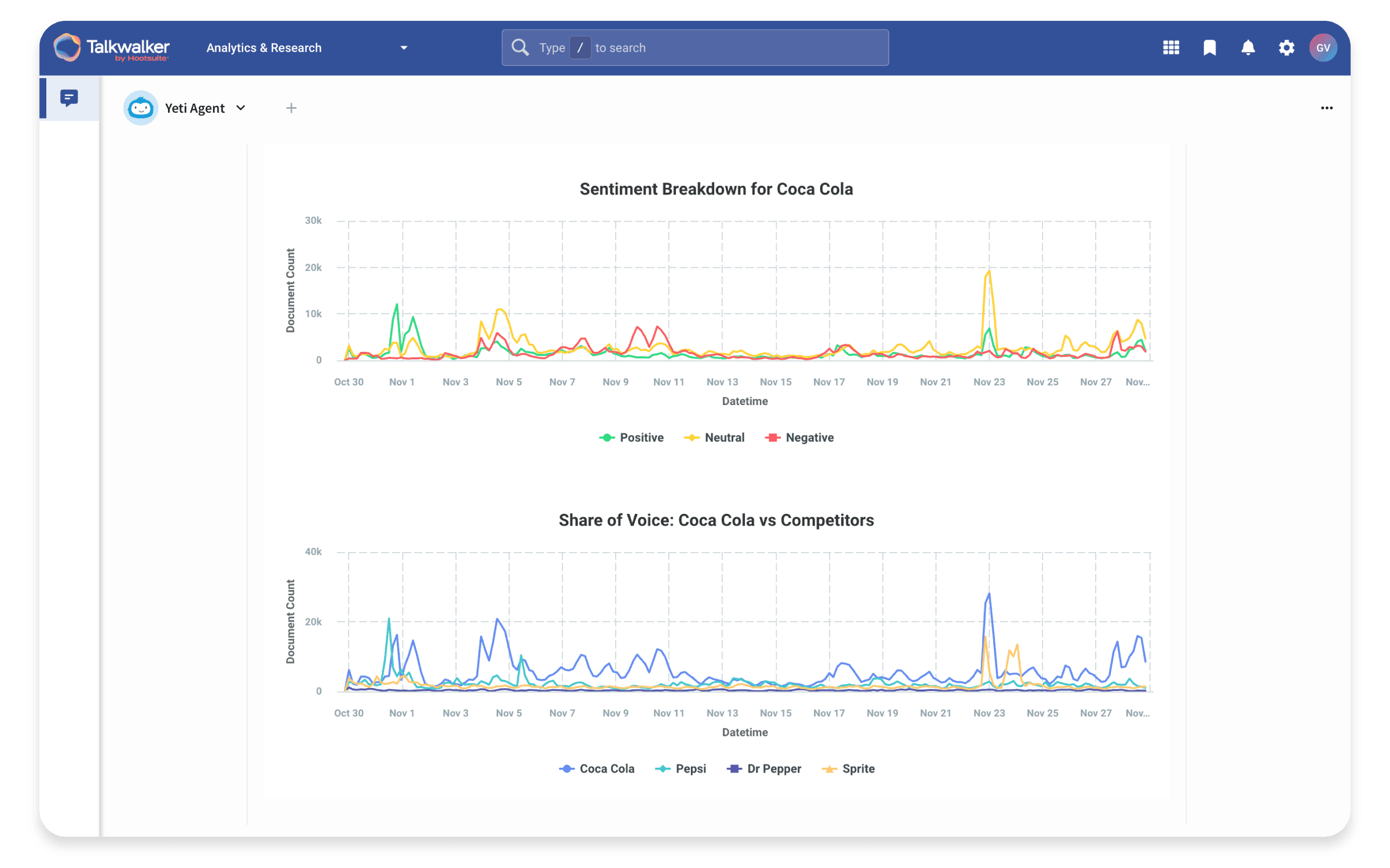 AI agents don't need complex Boolean queries. You can just ask an AI agent like Yeti to monitor sentiment about your brand, your industry, and your products. It will analyze social and media content to understand your ongoing share of voice. It also identifies topical shifts that can impact your reputation and marketing strategy.