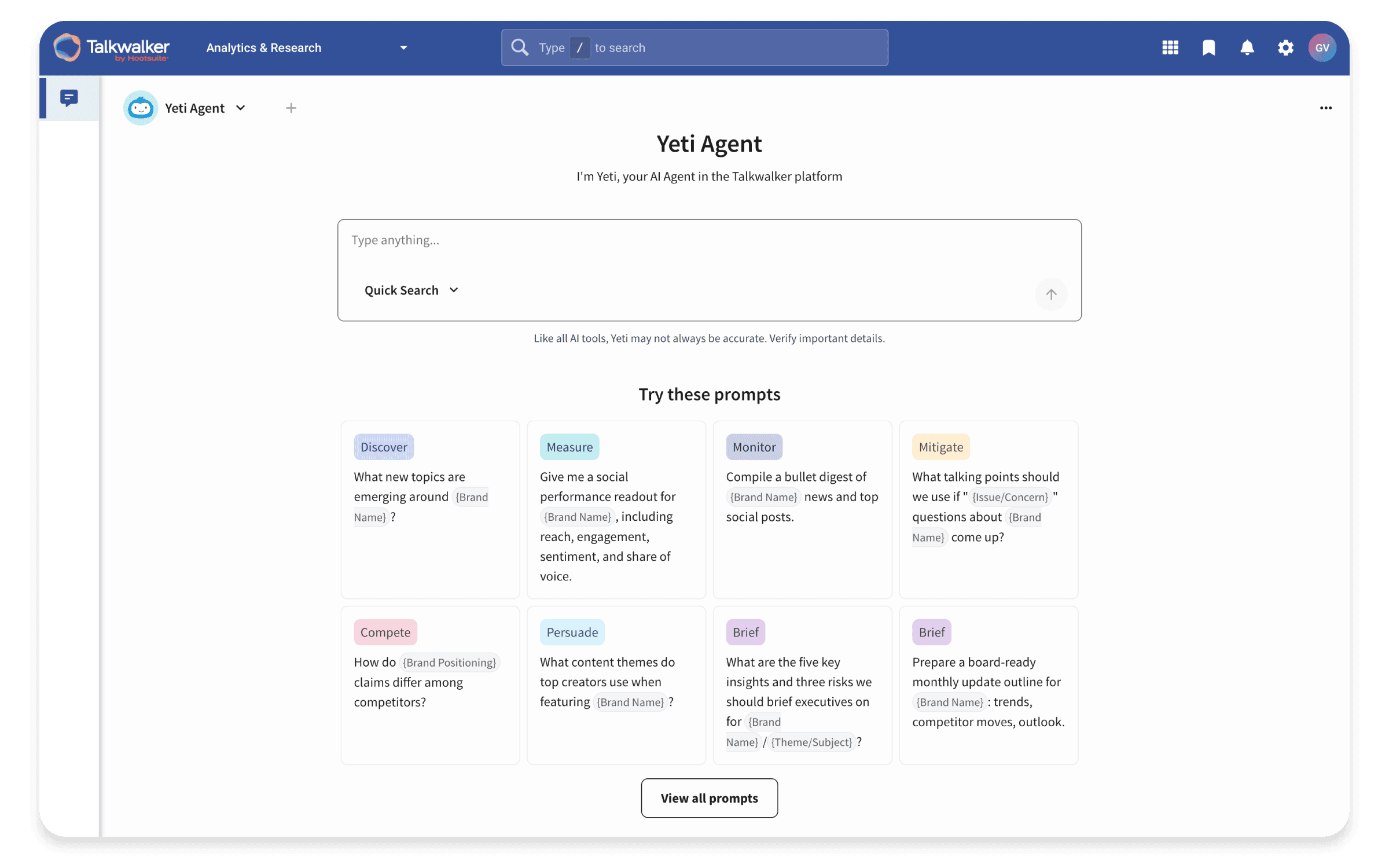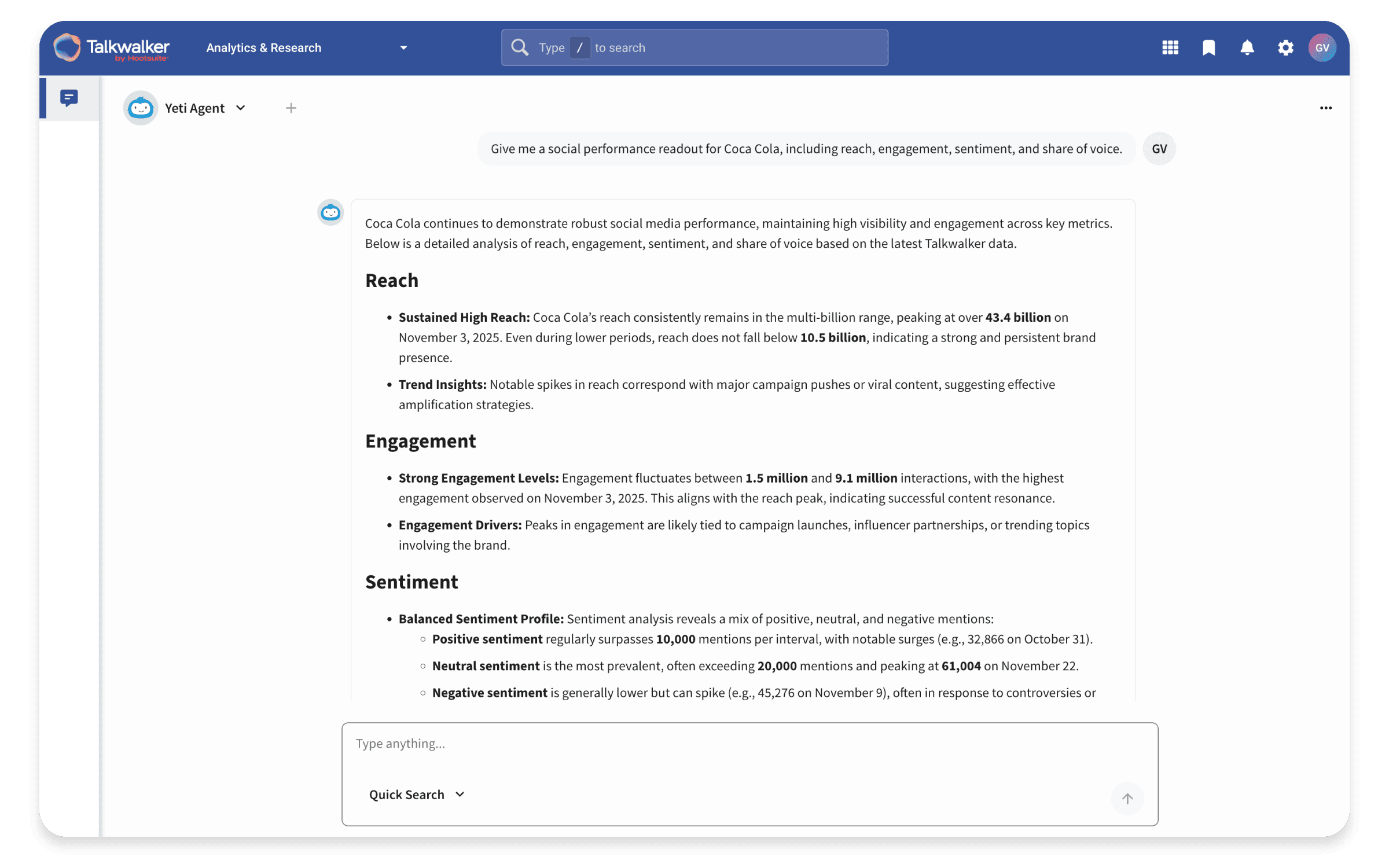 For example, Talkwalker’s Yeti Agent is your AI marketing and insights partner. It turns real-time data into speedy decision-making. Yeti's agentic intelligence can perform autonomous or semi-autonomous analytical and reasoning actions. This reduces the need for team members to manually set up, query, or interpret data.
