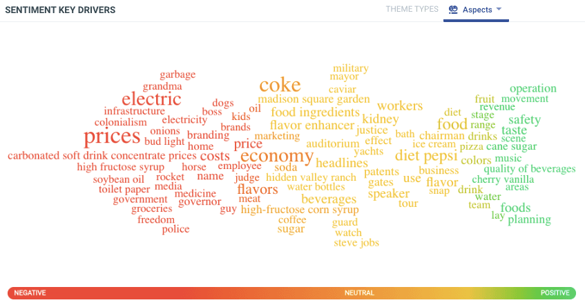 For example, this sentiment analysis shows that Pepsi customers feel good about the product quality, but have some concerns about high-fructose corn syrup. And they have big concerns about prices.