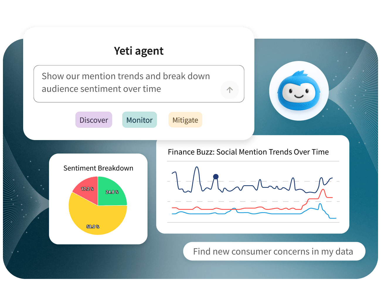 Visual showing Talkwalker’s Yeti AI Agent interface with a query asking to show mention trends and audience sentiment over time. Includes Discover, Monitor, and Mitigate options, a sentiment breakdown pie chart, and a social mention trends line graph. Highlights how AI agents surface real-time consumer insights.