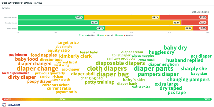 Consumer intelligence reveals the key sentiment drivers show that cloth and disposable diapers are represented nearly equally with positive sentiment.