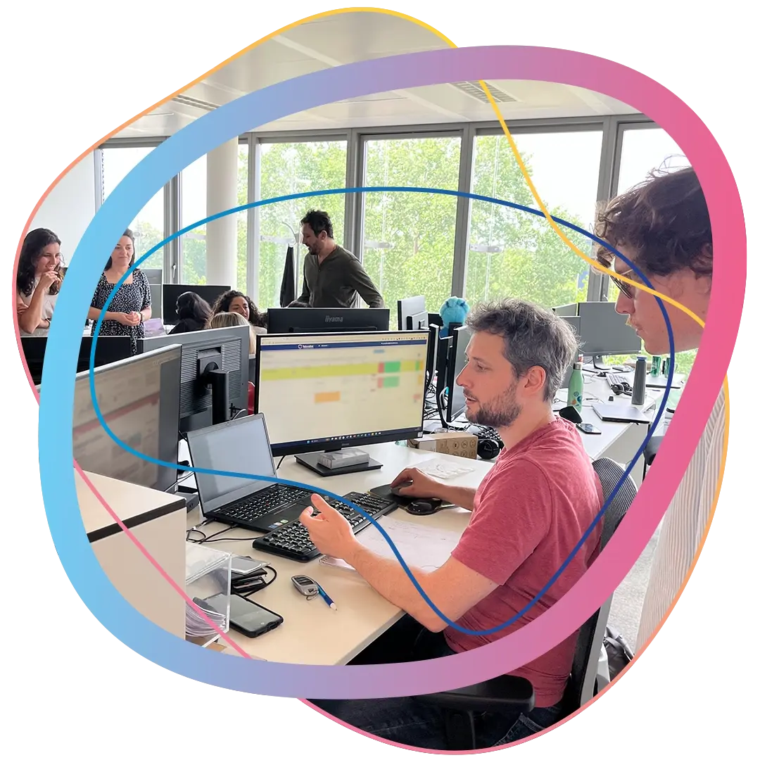 Some of the Talkwalker team in the office. One man in the foreground is working on a computer, processing a customer account. Other members of the team are in the background, happily working and chatting amongst themselves.