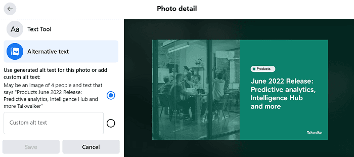 En 2016, Facebook a introduit sa fonction AAT (automated alt text). Le processus utilise la reconnaissance d'image alimentée par l'IA avec l'apprentissage automatique pour trouver les caractéristiques de base d'une image et les traduire en texte alt.