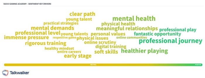 Gucci Gaming Academy’s focus on mental and physical health was among the sentiment key drivers for the 34% positive sentiment around the fashion giant’s new initiative.