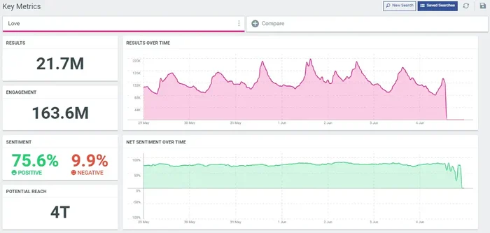Use our AI-enabled sentiment analysis to understand how your audience feels. Look at the sentiment around your brand mentions and how it fares against your competitors. You can also use social media search to measure brand awareness by looking at the total volume of your mentions.