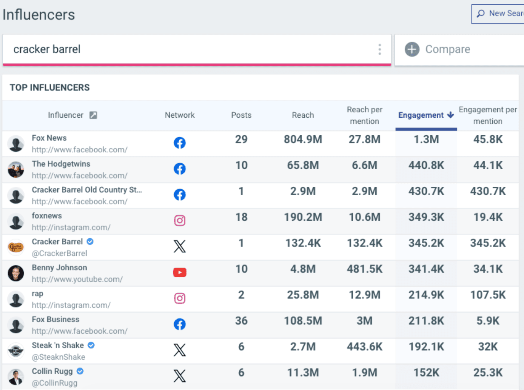 For example, here’s who’s driving the conversation about Cracker Barrel’s logo change, sorted by greatest engagement.