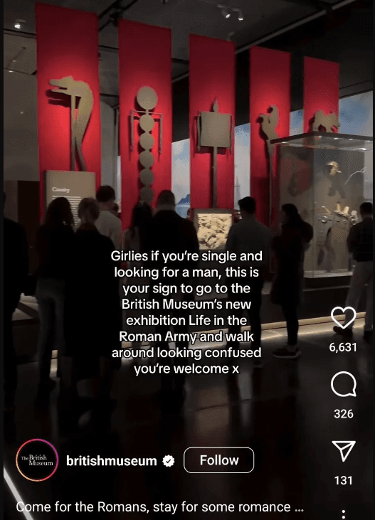 The post suggested "girlies" visit their Roman Army exhibition to find men by "looking confused." It was meant to riff on a TikTok trend about men pondering the Roman Empire. But social media users, especially academics, criticized the post as sexist and unprofessional.