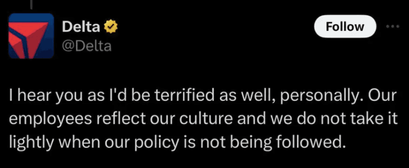 Delta's social media team responded by saying they'd be "terrified as well." Of course, the internet exploded, accusing Delta of anti-Palestinian bias and calling for boycotts.