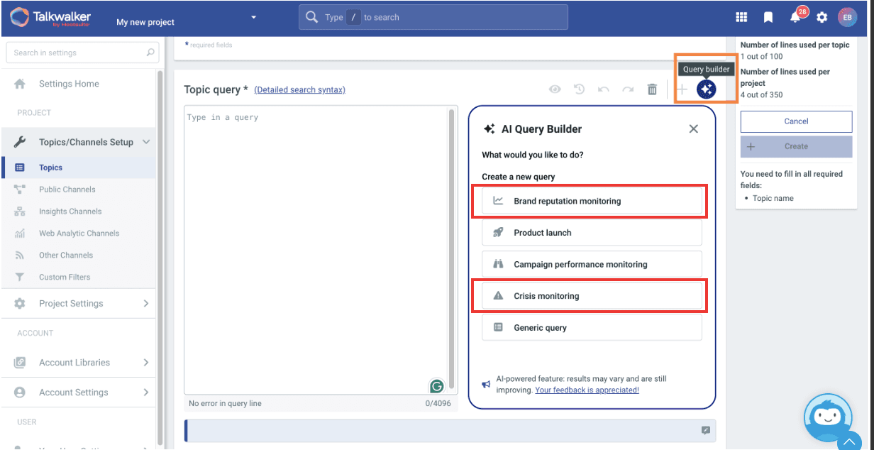 Talkwalker’s AI Query Builder helps make sure you capture the full scope of the conversation. Use the Brand Reputation query builder to help you keep an eye on things before a crisis emerges. If you’re already dealing with a crisis, create a new query using the Crisis monitoring option.