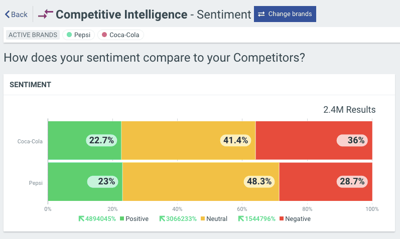 For example, here’s a real-time snapshot of the sentiment for Coke vs. Pepsi. If this were a crisis moment, Coke would want to analyze Pepsi’s social media presence and strategy to see why they have less negative sentiment.