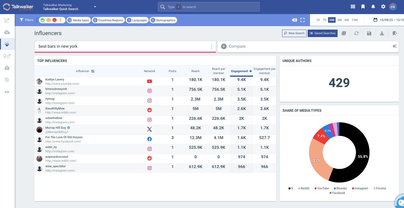 As we mentioned above, there’s not technically a single social media search engine to provide useful content results for consumers. However, for marketers, Talkwalker is an effective cross-platform social media search tool.