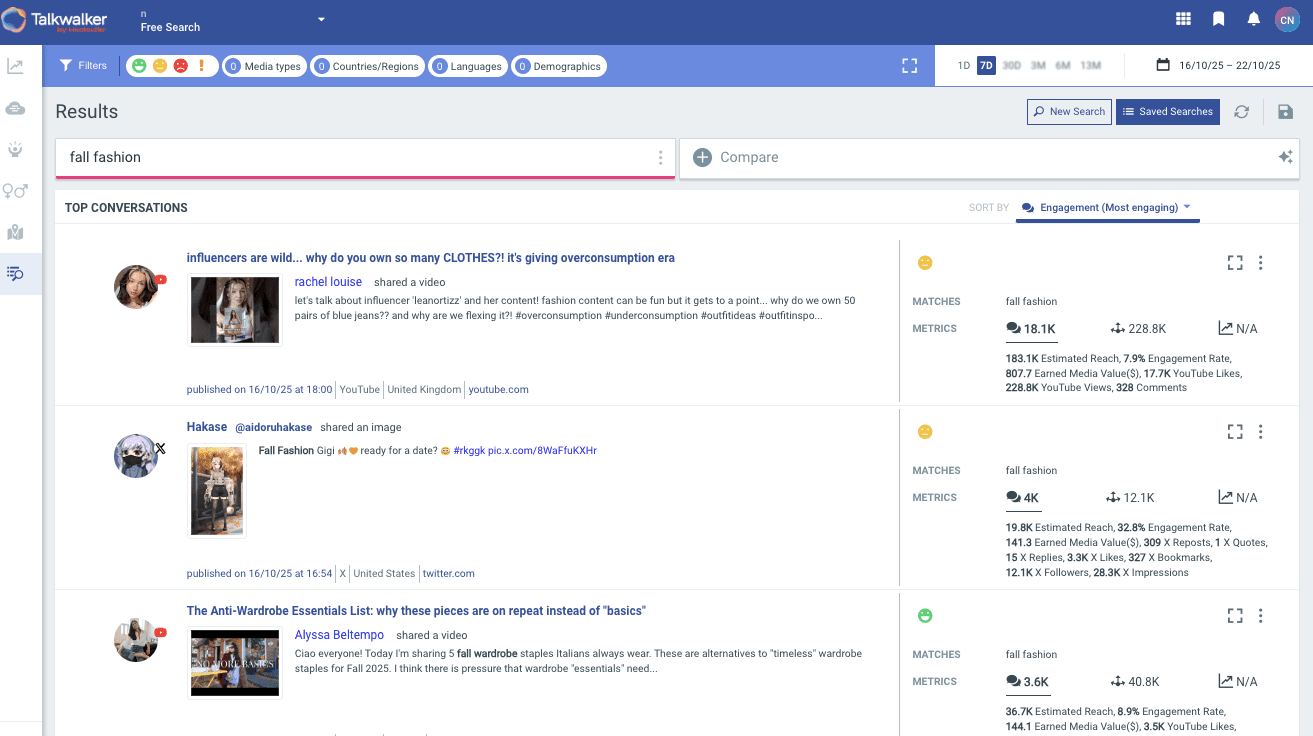 You can see key metrics for your search, like results, sentiment, and engagement level, top themes, and even the demographics of people posting about your topic.