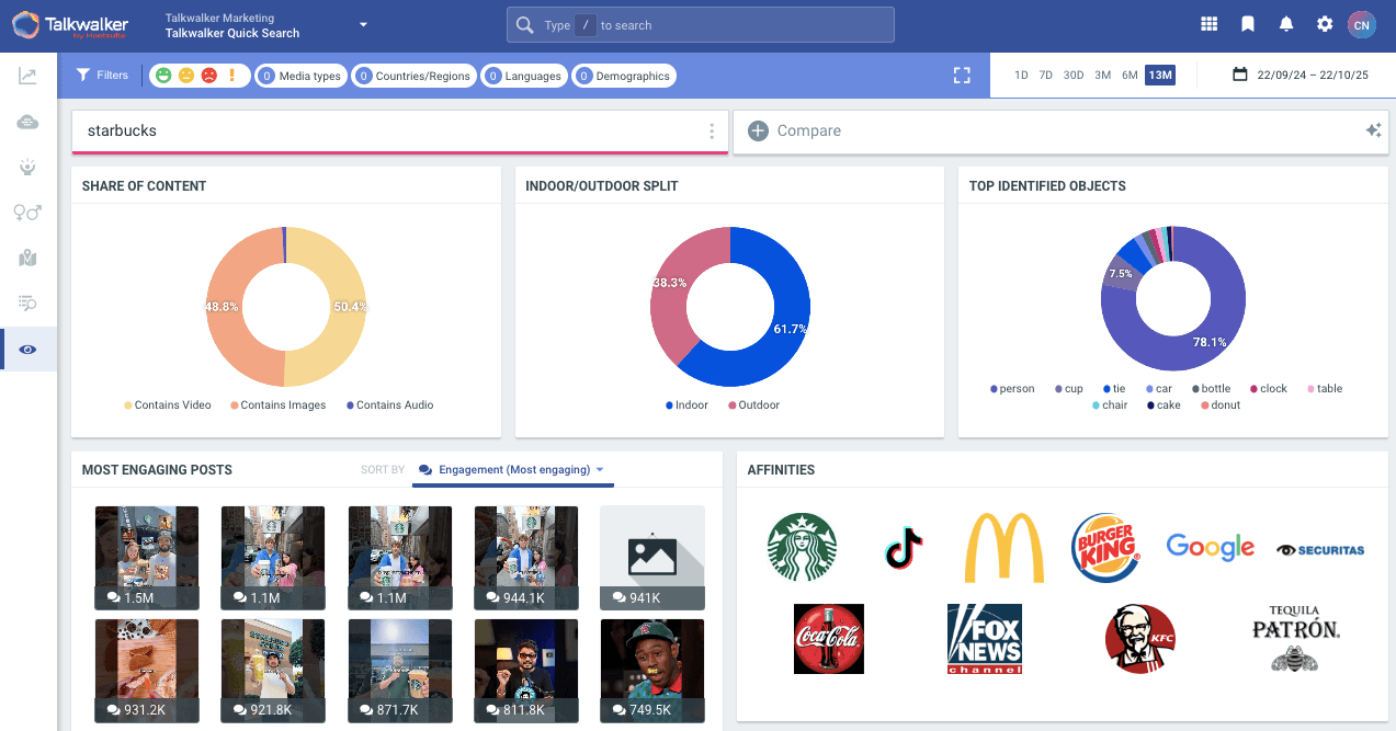 The full version of Talkwalker includes image recognition, visual insights, reverse image search, and video analysis to make sure your social search results include all mentions of your brand. You can also see your share of content (for images, videos, and audio), and understand what the top identified objects are that appear in content about your brand.