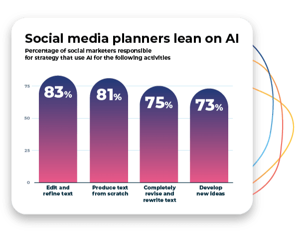 While AI has become essential for content creation, it’s also reshaping social media strategy at the highest levels. Over three-quarters of C-level executives and VPs responsible for social strategy are now using AI to assist with social media activities. And they’re using it even more than those responsible for execution.