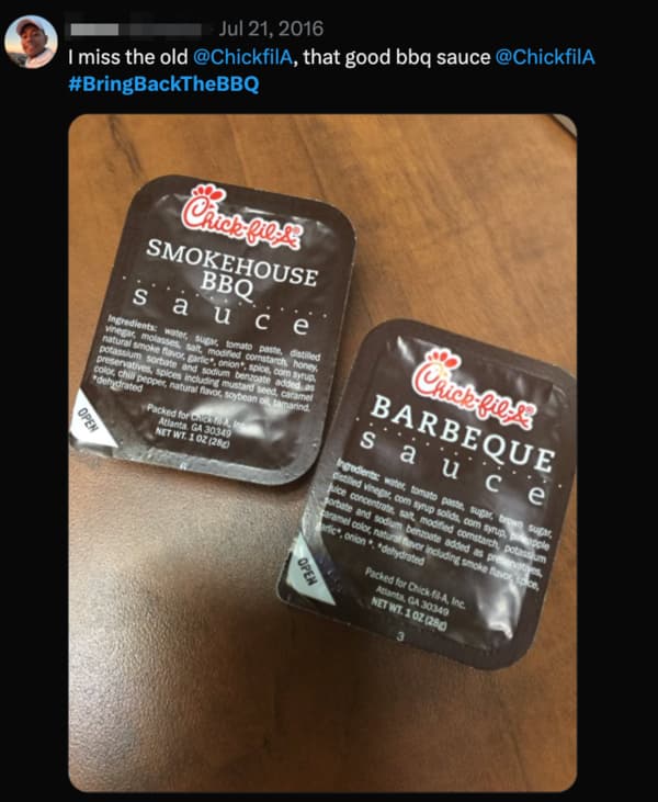 In 2016, Chick-fil-A changed its barbecue sauce recipe. Complaints immediately flooded social media channels with the hashtag #BringBacktheBBQ.