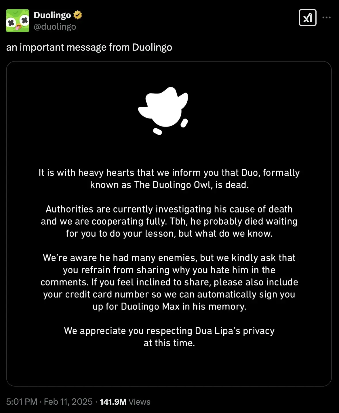 The language learning app shared the news across social media platforms with a somber post: "It is with heavy hearts that we inform you that Duo, formally known as The Duolingo Owl, is dead."