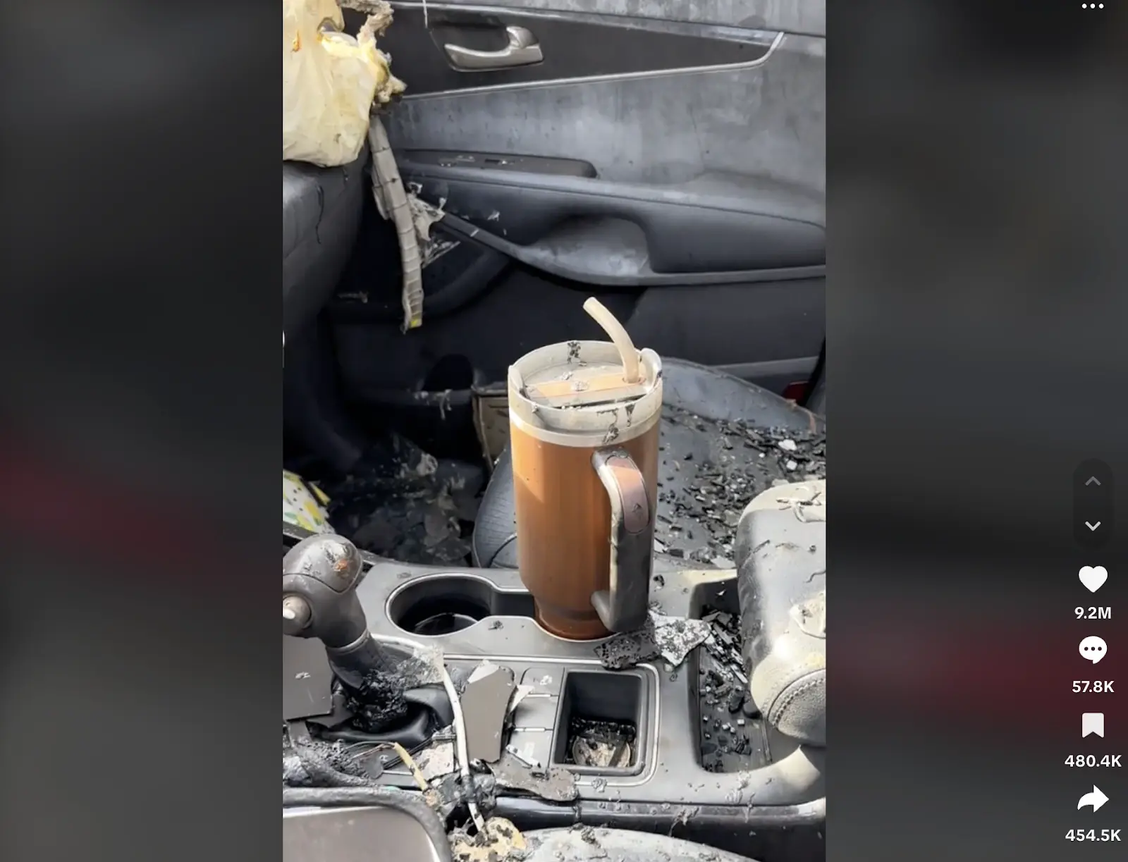 In November 2023, TikTok user @danimarielettering posted a video showing her Stanley cup intact after her car burned completely. In fact, even ice remained inside the cup despite the intense fire.
