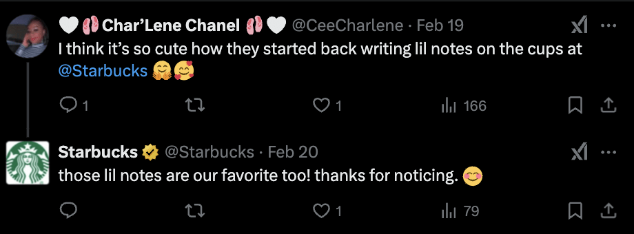 When customers share their Starbucks experiences, the brand comments specifically about the drink choice or location.