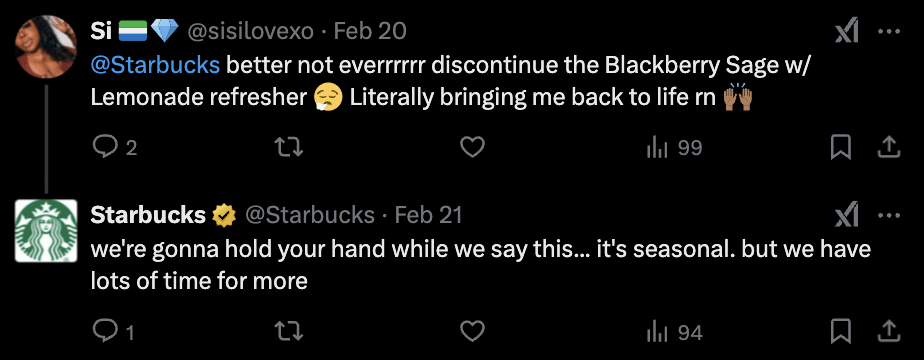 The brand maintains a consistent presence across platforms and leverages pro-active community management. Starbucks responds to customer posts, comments, and questions with personalized replies that feel genuine and conversational.