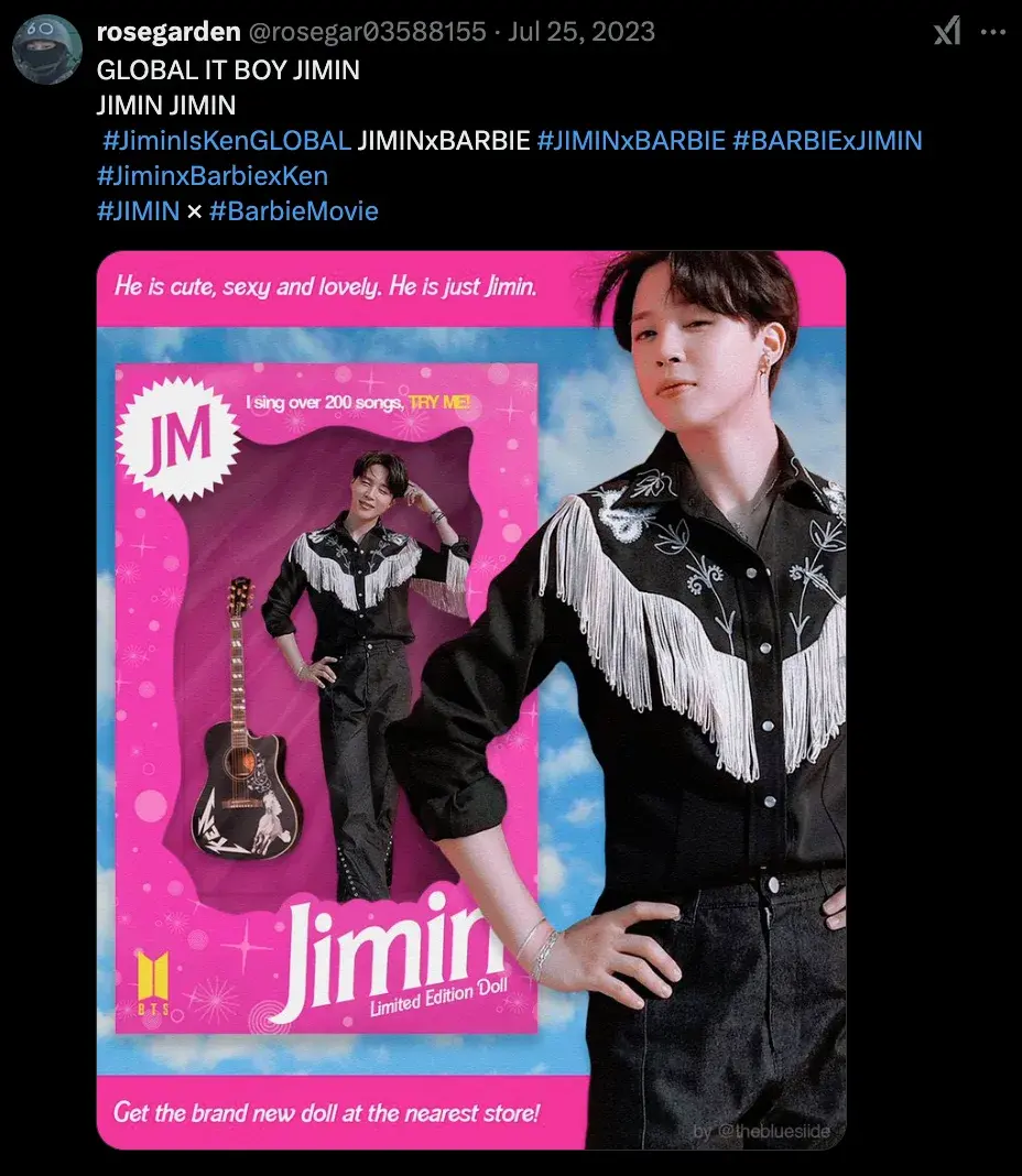 In July 2023, fans on social media noticed that Ryan Gosling's Ken outfit in the "Barbie" movie resembled an outfit worn by BTS member Jimin in a music video.
