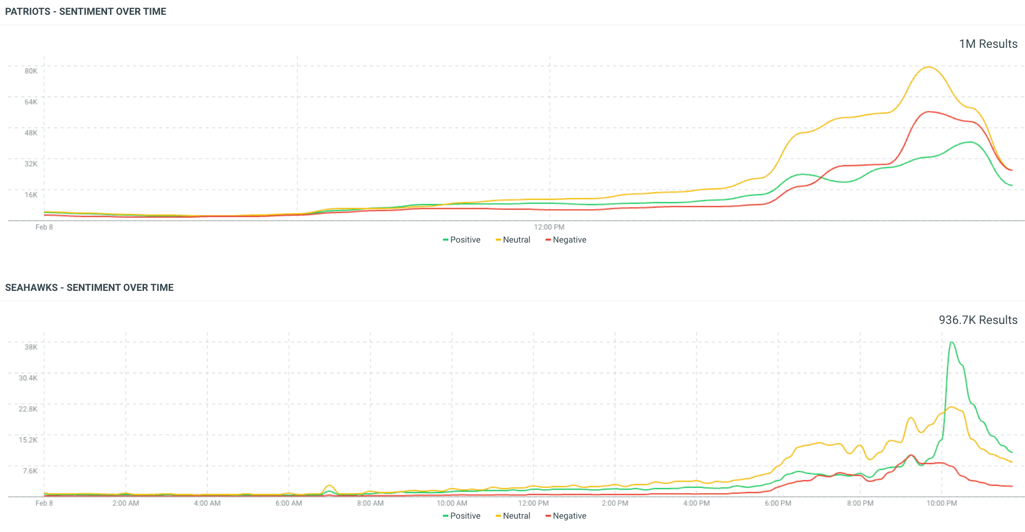 Patriots fans, meanwhile, recorded a higher post-game negative sentiment peak on February 10 (104 vs Seahawks’ 53), suggesting greater disappointment following the final outcome.