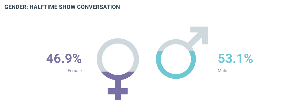 In contrast, the halftime show attracted a more balanced gender split, with female-identifying audiences contributing to 46.9% of all online conversations.