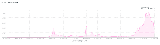 Mentions of Labubu over the last 24 months (Aug 21, 2023 to Aug 21, 2025); 10% sample; Talkwalker Social Listening