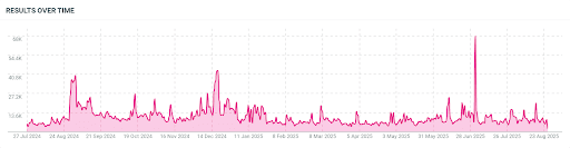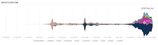 Between April and July 2025, celebrity endorsements and nonstop media coverage pushed online mentions to a high of 635,000 in a single week (July 21, 2025).