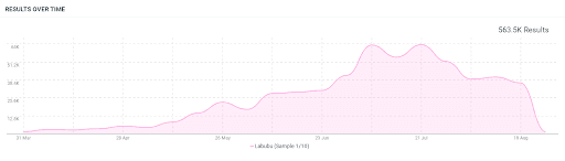 Mentions of Labubu over 5 months (Apr 1, 2025 to Aug 21, 2025); 10% sample; Talkwalker Social Listening