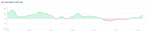 In the fanbase stage, net sentiment peaked at +78.8%. Over the last few months, it plunged into the negative, bottoming out at -24.4% — a rare dip for a brand not in crisis.