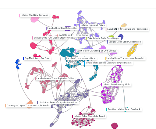 Conversation clusters from July–August 2025 highlight the key themes: Lisa’s influence, counterfeit risks, and brand collaborations. These are the conversations Pop Mart should monitor for opportunities and crises.