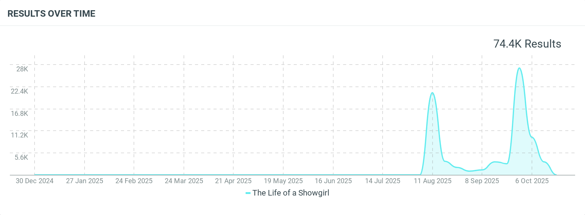 Line graph showing mentions of The Life of a Showgirl from Dec 2024 to Oct 2025. Activity spikes in August and October 2025, totaling 74.4K results.