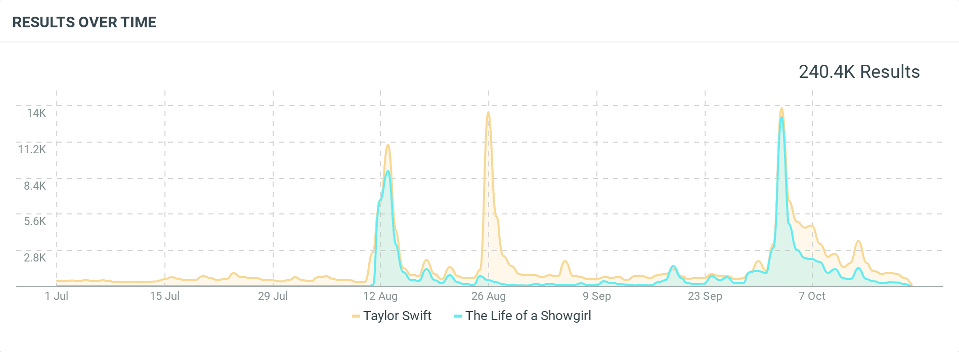 Comparison line graph of Taylor Swift and The Life of a Showgirl mentions from July to October 2025. Both peak simultaneously in August and October, with a total of 240.4K results.