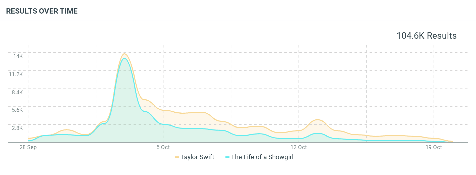 Zoomed-in comparison line graph showing Taylor Swift and The Life of a Showgirl mentions from late September to mid-October 2025, peaking around October 4 with 104.6K total results.