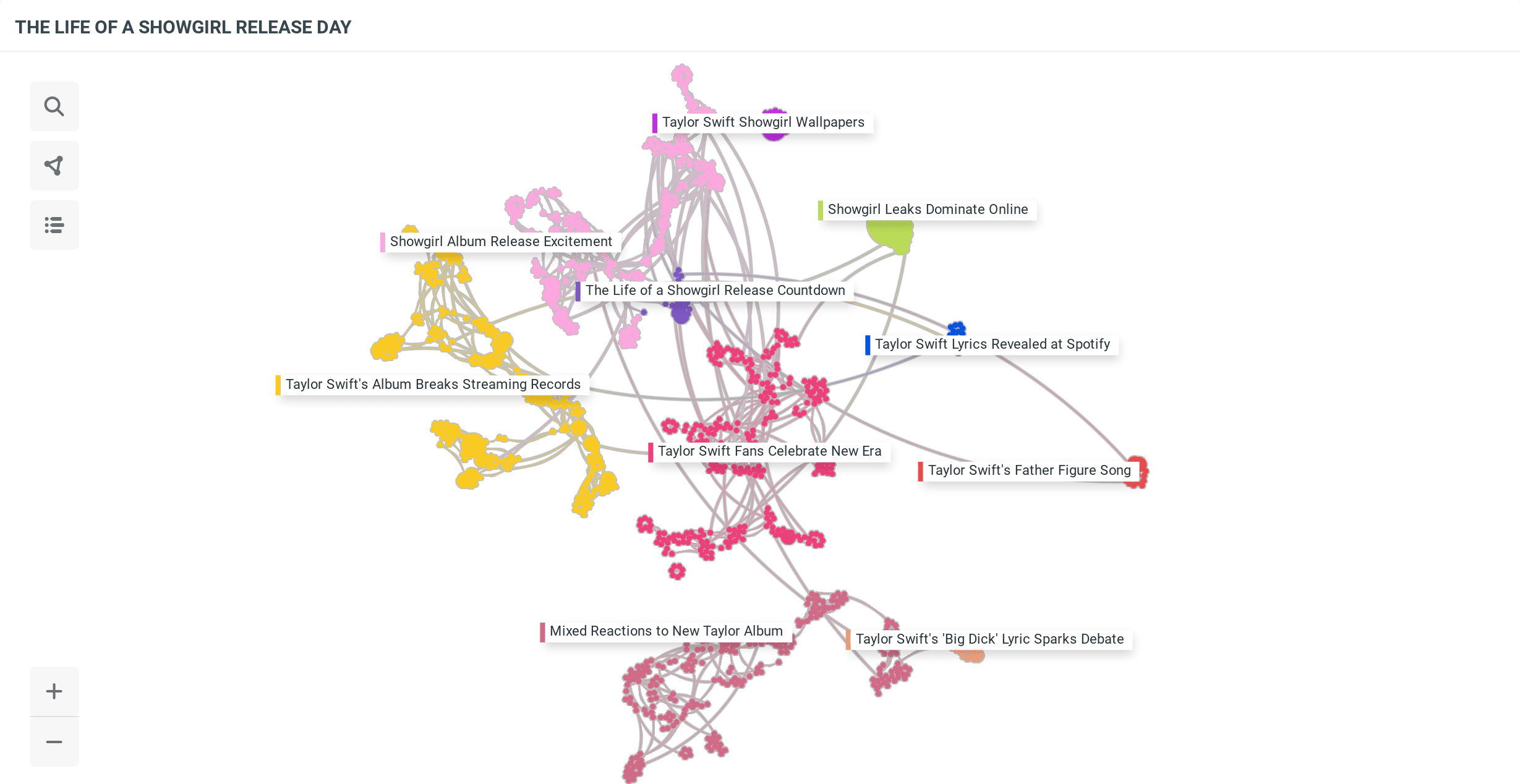 Network graph titled “The Life of a Showgirl Release Day” showing clusters of conversation topics such as “Showgirl Album Release Excitement” and “Taylor Swift’s Father Figure Song.”