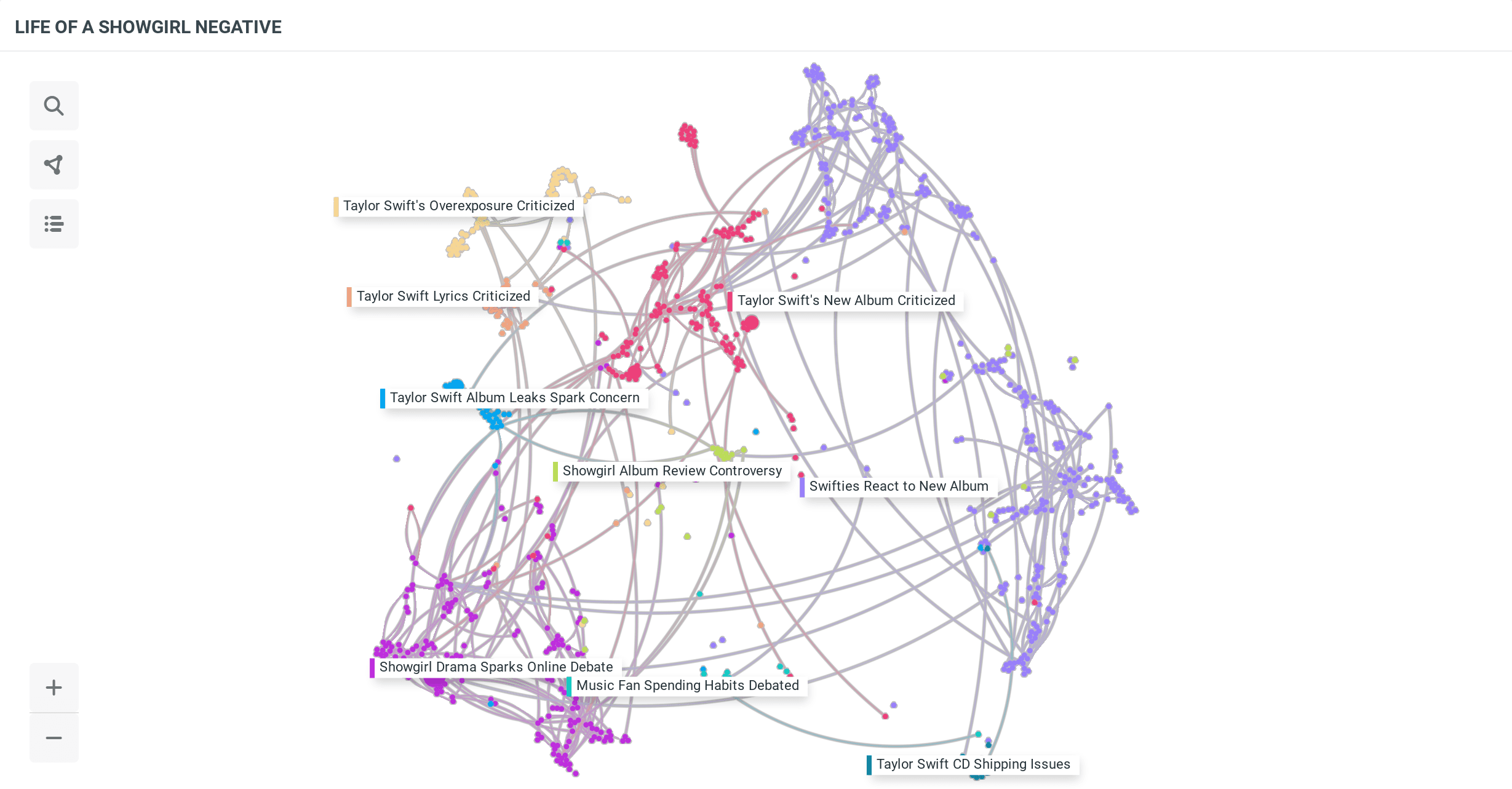 Network visualization titled “Life of a Showgirl Negative” mapping critical discussions around the album. Key nodes include “Taylor Swift’s New Album Criticized” and “Showgirl Album Review Controversy.”