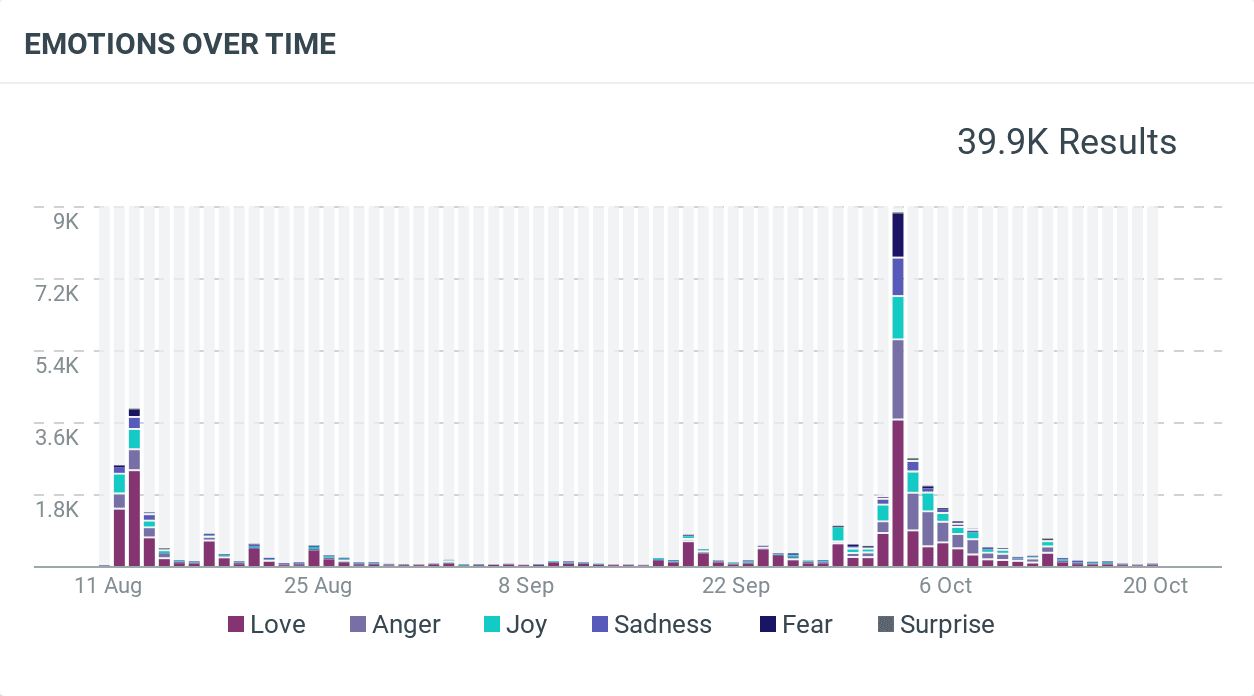 Unsurprisingly, nearly half of all emotional mentions were linked to love (46.6%), with spikes on announcement and launch days.