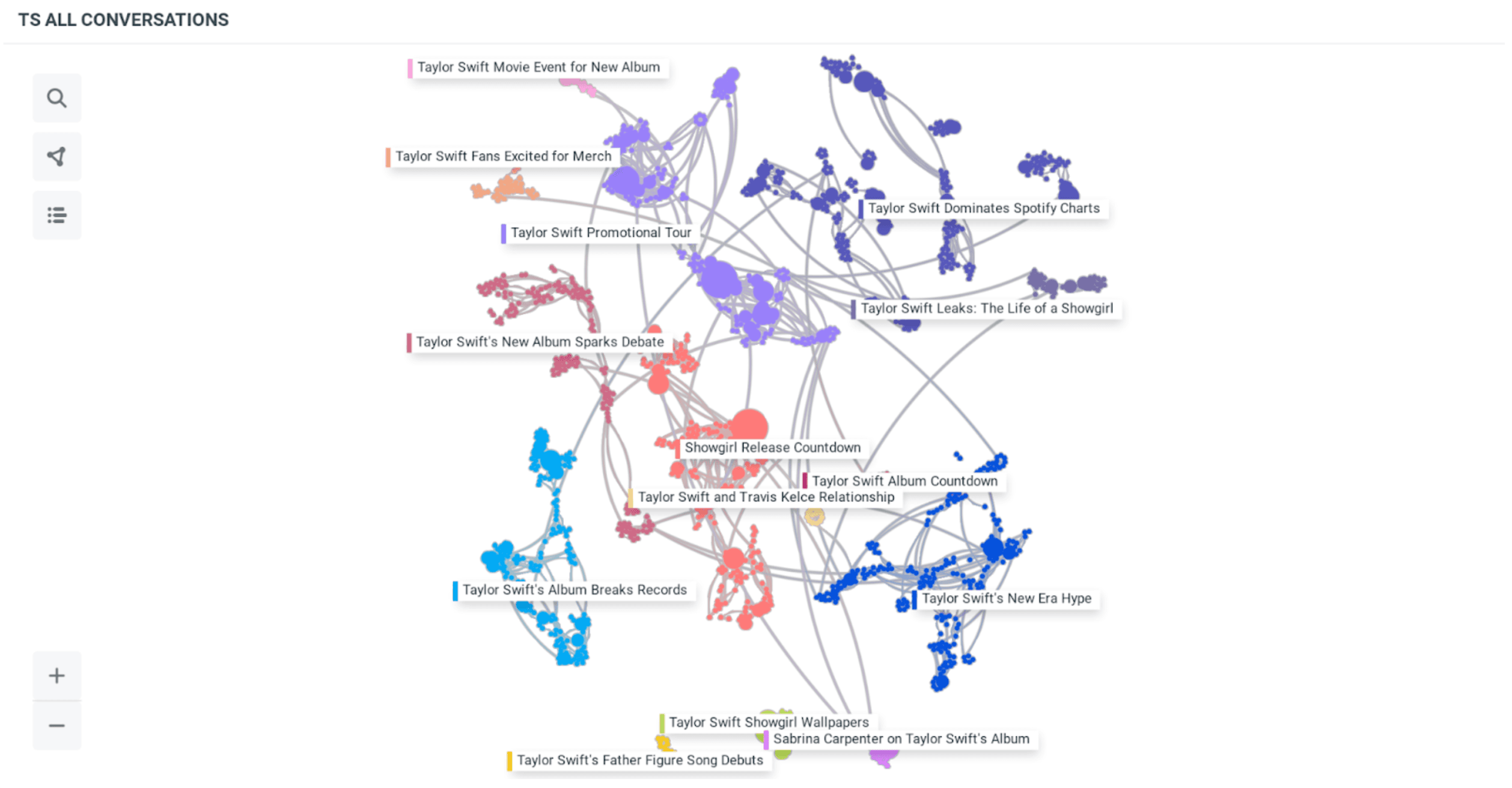 Network graph titled “TS All Conversations” connecting major topics like “Taylor Swift Leaks,” “Showgirl Release Countdown,” and “Travis Kelce Relationship.”