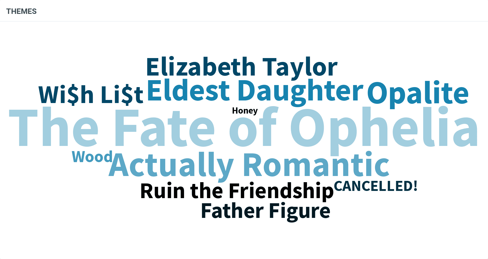 Word cloud titled “Themes” highlighting recurring topics such as “The Fate of Ophelia,” “Eldest Daughter,” “Actually Romantic,” and “Father Figure.”