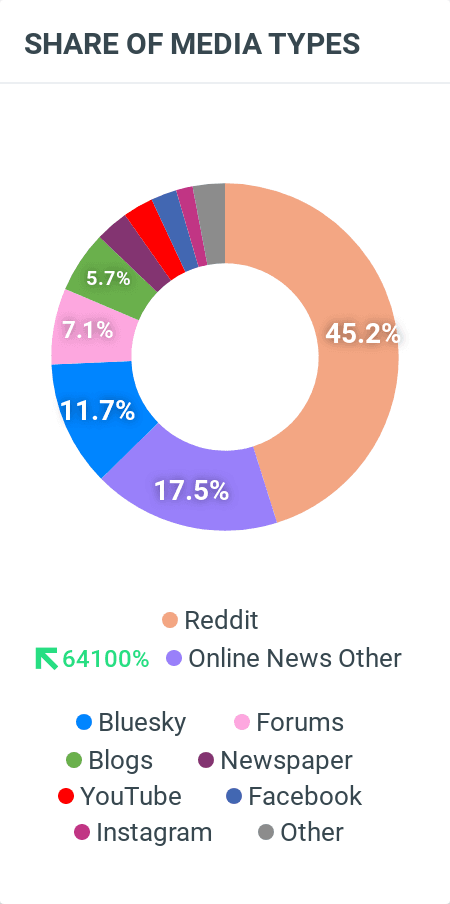Donut chart titled “Share of Media Types” showing the distribution of coverage sources: Reddit (45.2%), online news (17.5%), Bluesky (11.7%), and others including forums, blogs, and YouTube.