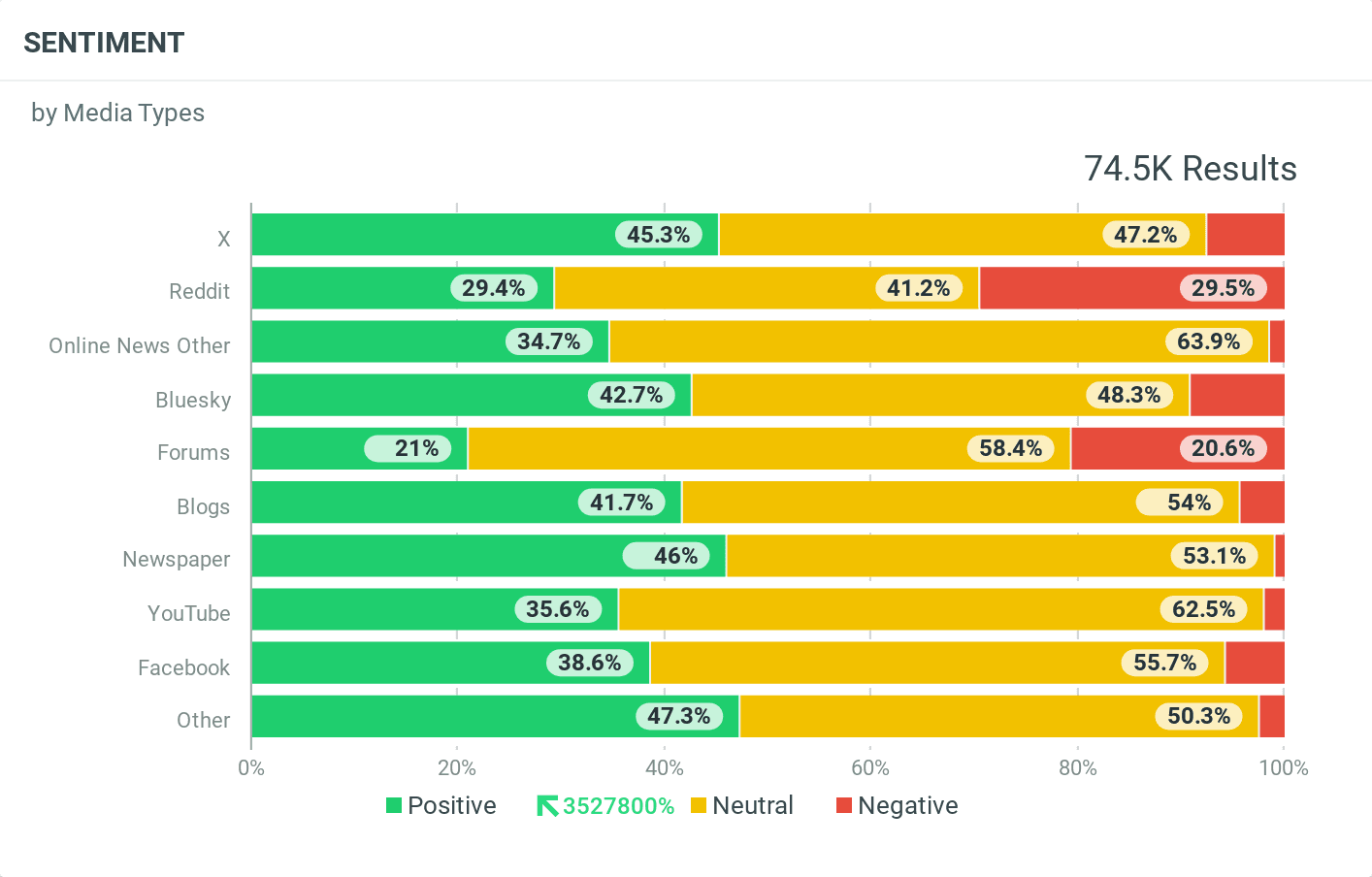 Horizontal bar chart titled “Sentiment by Media Types” comparing positive, neutral, and negative mentions across platforms. X and Bluesky show the highest positivity, while Reddit and YouTube have higher negative sentiment. Total 74.5K results.