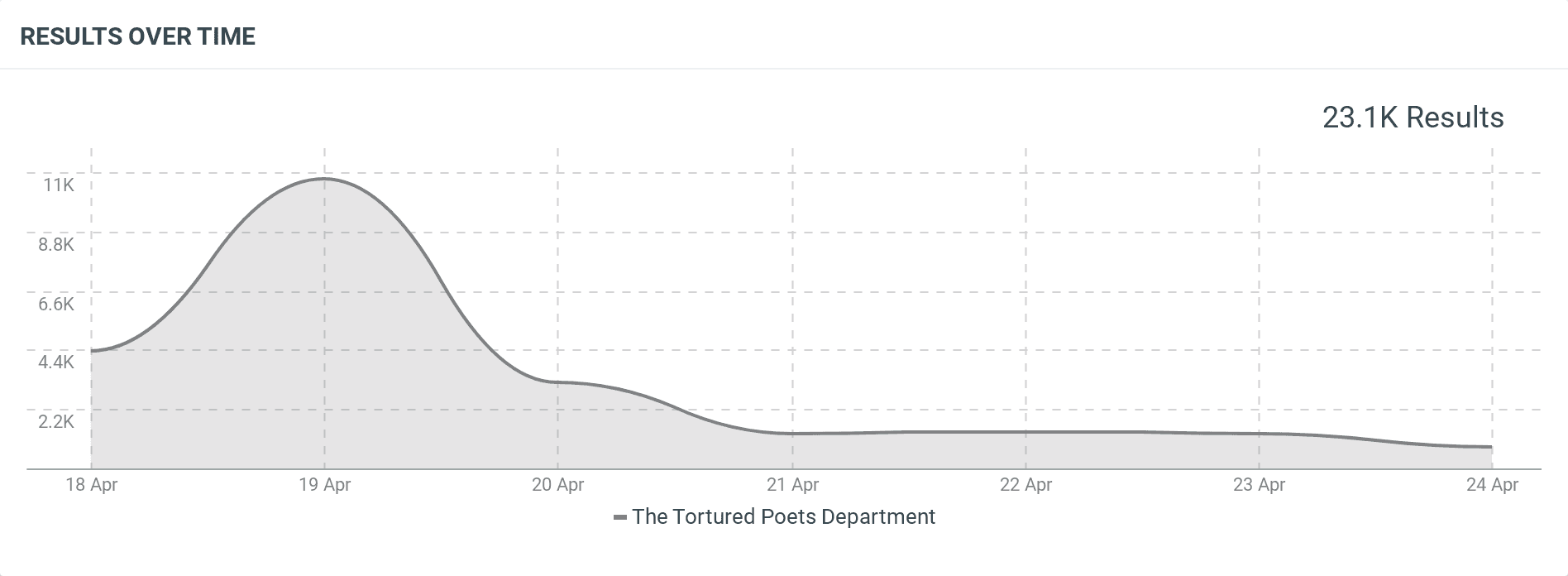 Line graph showing mentions of The Tortured Poets Department from April 18–24. Mentions peak sharply around April 19 at about 11K before declining steadily to 23.1K total results.