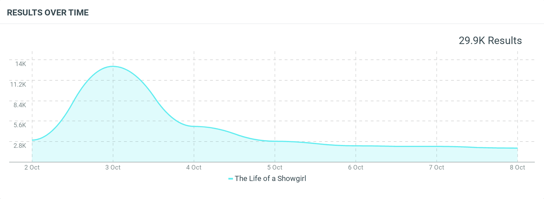 Line graph showing mentions of The Life of a Showgirl from October 2–8. Mentions rise sharply to a peak near October 3, reaching roughly 14K before tapering off to 29.9K total results.